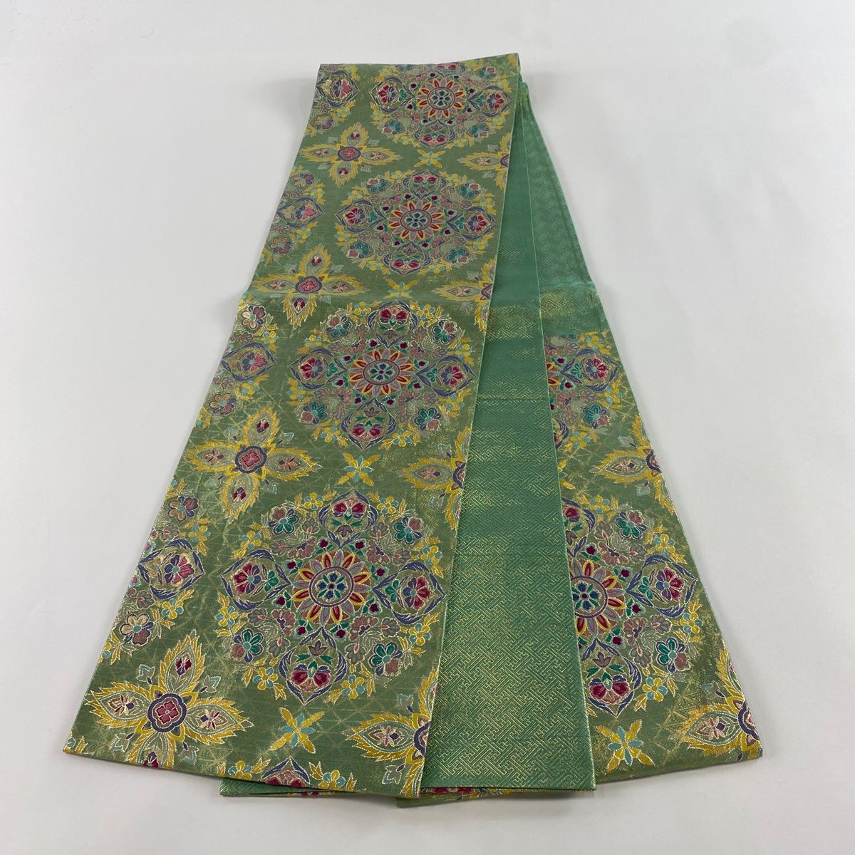 袋帯 秀品 華文 銀糸 箔 薄緑 六通 正絹