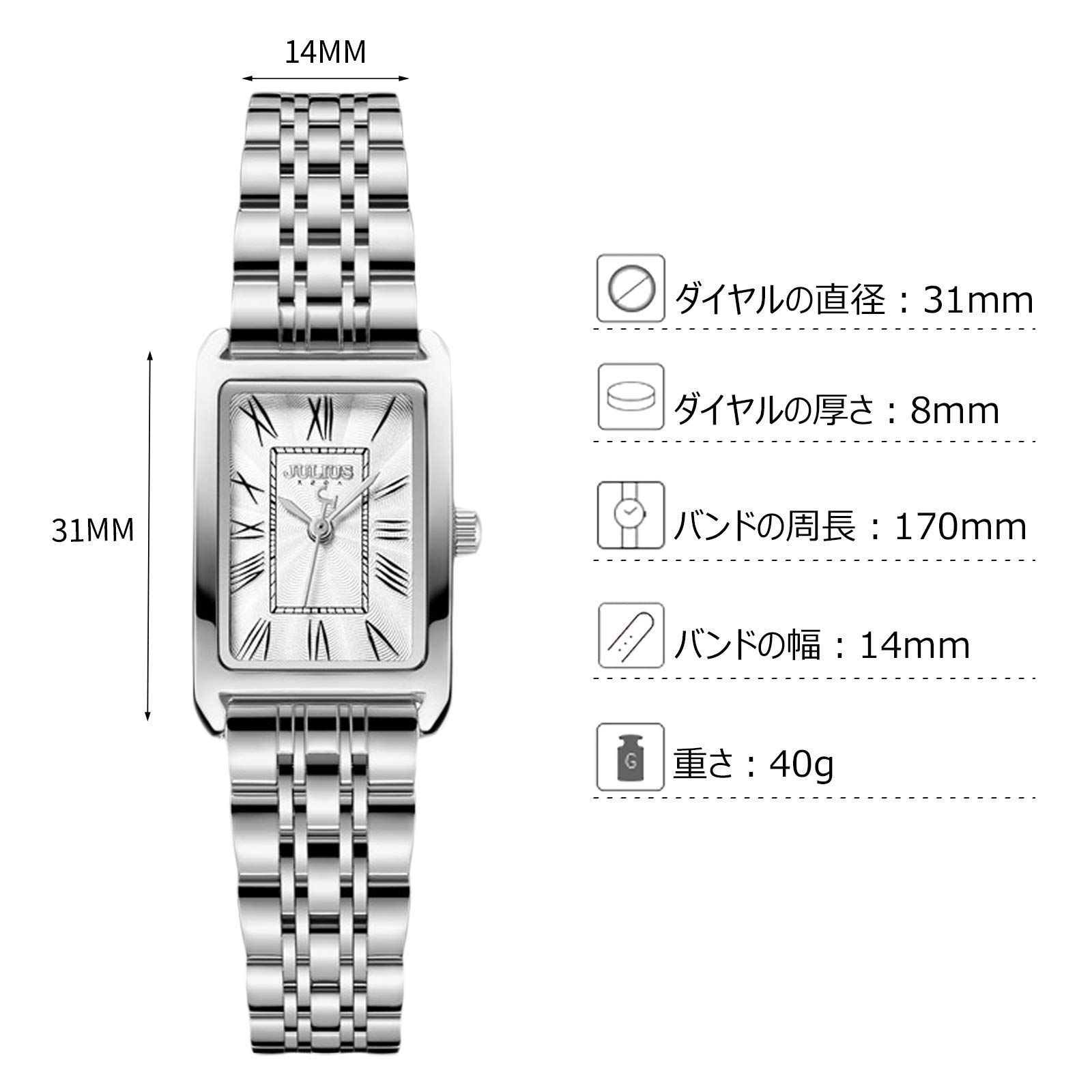 【仕様】ダイヤルの直径:31mm、ケースの厚み: 8mm、バンド幅:14mm、 周長:170mm、 重さ:40g。スクエアフェース、ステンレスバンド、日本製クオーツムーブメント、アナログ表示。