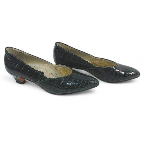 新宿屋 パンプス ハンドメイド 型押し グリーン レザー 22.5㎝ EE