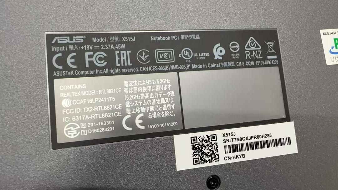 ノートPC ASUS X515JA/15.6インチ/Windows 11 Home (Sモード) 64ビット/Core i3-1005G1/メモリ8GB/SSD128GB