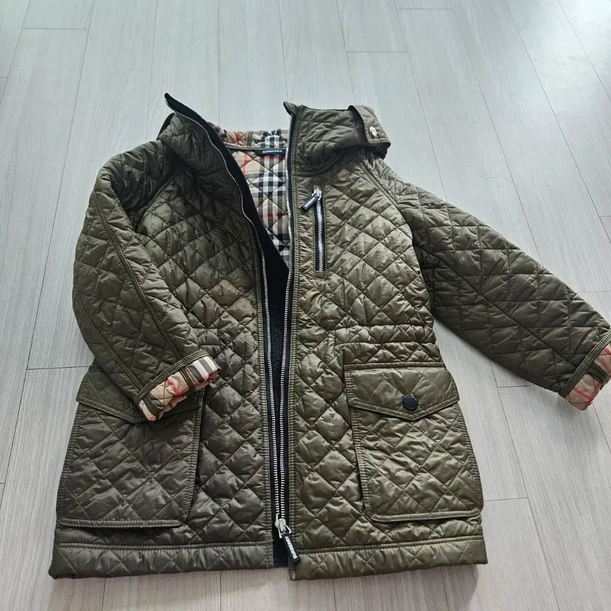 控えめな光沢のあるカーキ カラー 表地にバーバリー チェック 裏地が高級感があります。