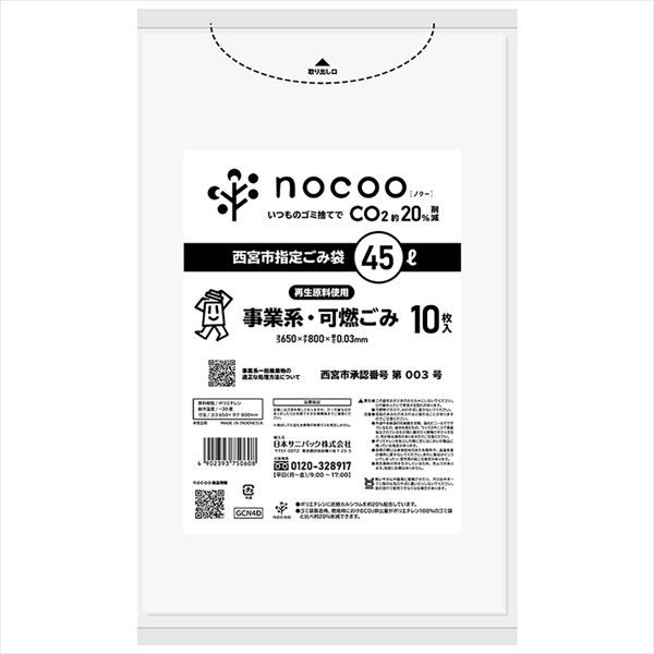 西宮市事業系可燃ごみ袋45L10枚。nocoo素材を使用し、二酸化炭素を20%削減。