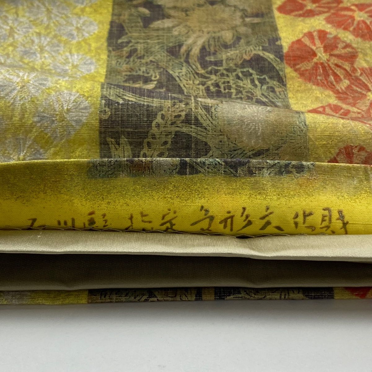 袋帯 落款 証紙 牛首紬地 草花 幾何学 金銀彩 灰緑 全通 正絹