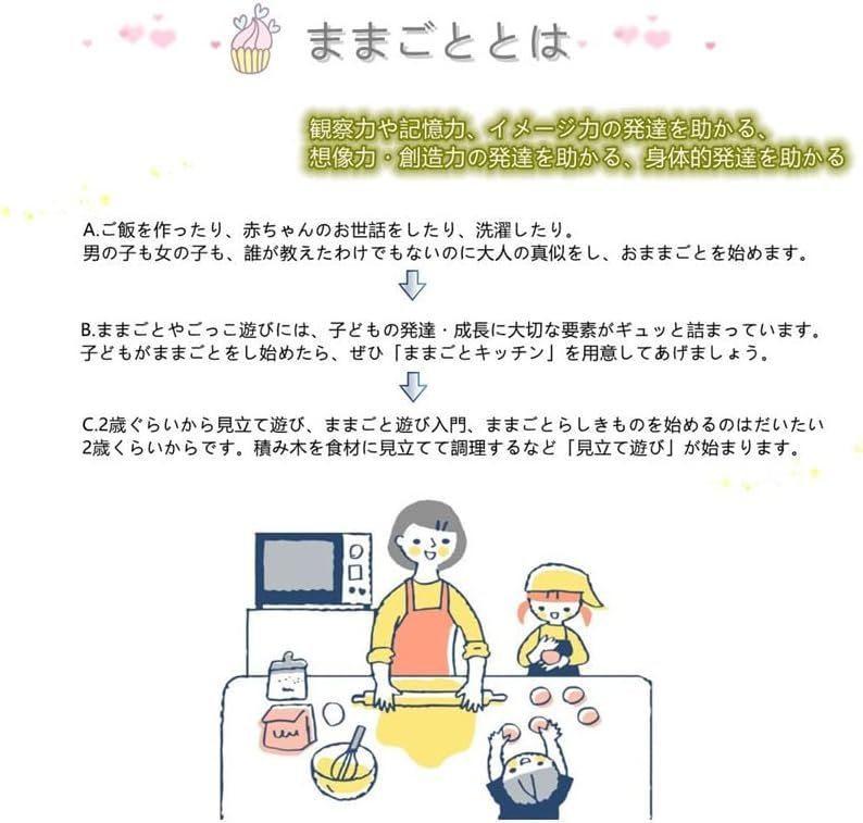 POINT 2 おままごとごっこ、リアリティの体験 1.調理器具と調味料を置ける棚 調理器具や調味料を収納できる棚とフック付き。おいたり、掛けたり、並ペてったり、お子さまの想像力を育みます。 2.くるくる回せる水道の蛇口、手洗いごっこも楽しめるシンク 自宅のシンクと蛇口とよく似合っています。 又は蛇口は回るので、リアリティの体験ができます。蛇口で野菜を洗ってみたり、手を洗ってみたり。 3.360°回せるおつまみ オーブン操作用のツマミは、すベて力チカチと音を鳴らしながら360°回せます。 4.時計 調理するとき、時間を計算することが必要です。時計の設置で、リアリティ感がアップします。 5.おもちゃ箱にもなる収納スペース 下部には収納スペースがあり、おままごと器具やおもちゃなどもいっぱい入れます。