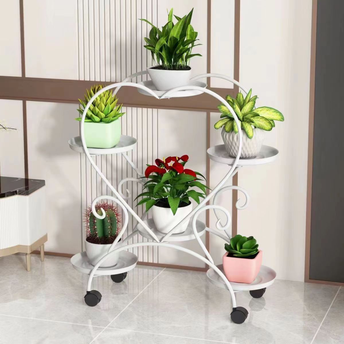 目を引くハートの形状と美しい花を飾ることができるフラワースタンド。プールサイドや庭、バルコニーなど、屋外でのガーデニングに最適なアイテムです。ヨーロッパの雰囲気を取り入れたおしゃれなデザインで、広がる花々が一層引き立ちます。