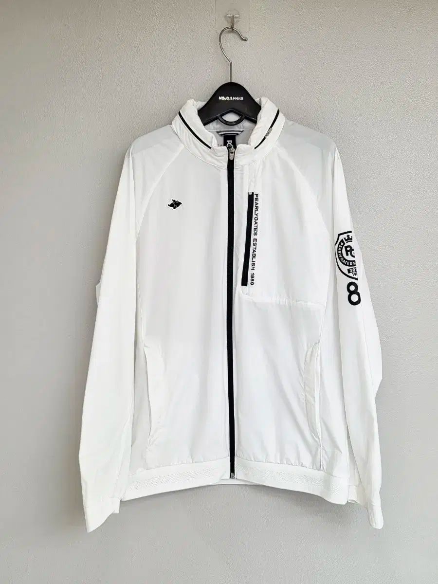 これは軽いウインドブレーカー林です。着用したときのフィット感はとてもきれいで、すっきりとした白い色には黒いロゴがアクセントになっていました。伸縮性があり動きやすく、春と秋は1枚で、冬はサブインナーとしても最適です。白い色はどんなゴルフウェアにもよく合います。