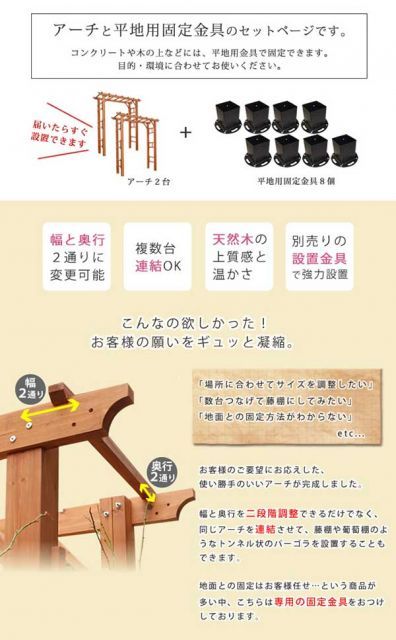 商品名:ガーデンアーチパーゴラ天然木パーゴラアーチ190幅2個+平地金具セット支柱幅可変155cmor180cm(内寸140cmor160cm)支柱奥行可変(46cmor55cm)外寸幅190.5cm奥行61cm高さ203cm木製アーチブラウンおしゃれ北欧ガーデニング屋外エクステリア天然木製フレックスパーゴラアーチ1902台組(平地金具セット)【アーチ門木製バラ薔薇フェンスホワイトブラウンおしゃれ小型北欧ガーデニング屋外家具ツタ蔦イングリッシュガーデンエクステリアロマンチックトレリス園芸支柱】天然木製アーチ門バラ薔薇朝顔フェンスおしゃれナチュラル北欧蔦ツタつたロマンチックトレリス園芸支柱【ライトブラウン】
