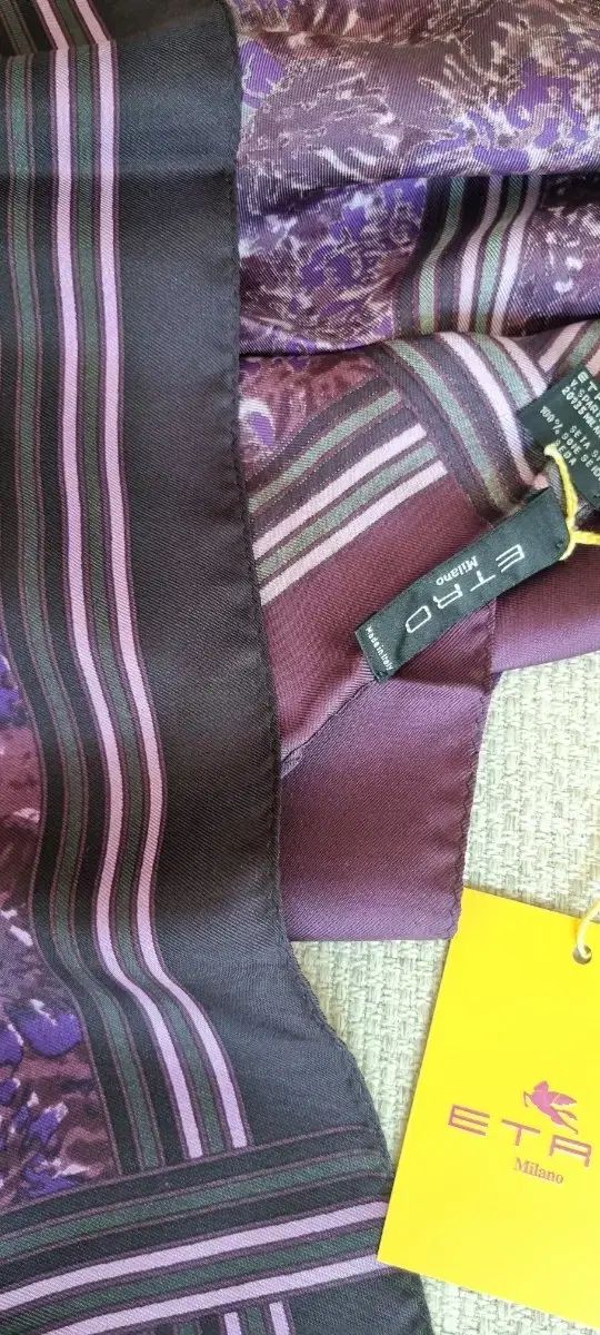 エトロ正規品 シルク スカーフ 新品です。高級感のあるパープル カラーに、エトロ特有のムーン(月)柄が際立ちます。シルク 素材なので柔らかく、着用感が良いです。