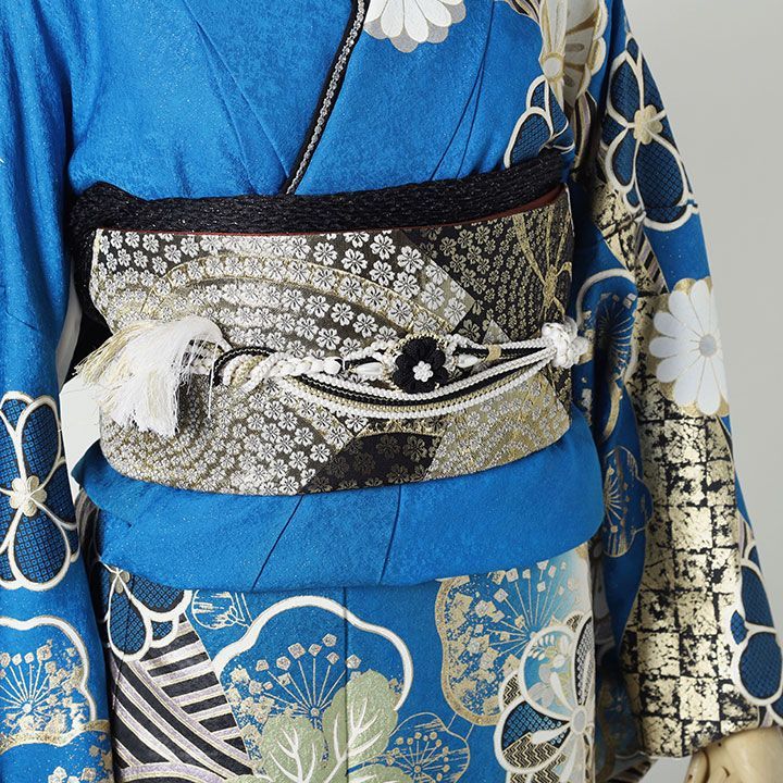 鮮やかなブルーの地色に、金銀をふんだんに用いた古典柄が映える、非常に華やかで格調高い一着です。帯は黒地に金糸や銀糸を織り込み、振袖の華やかさを引き締めています。