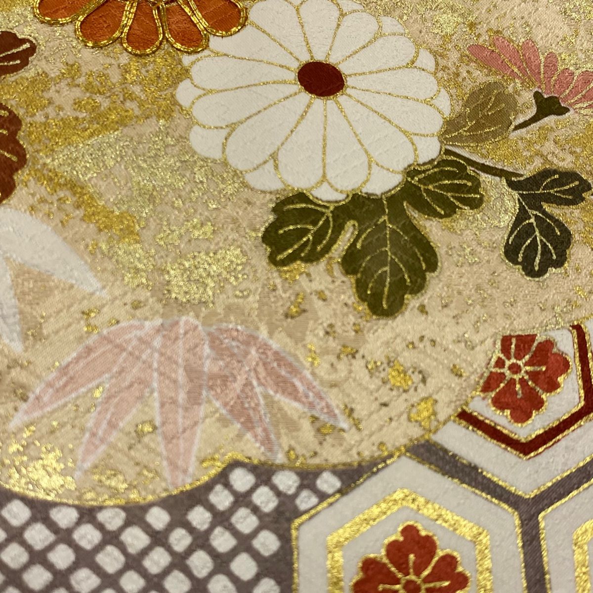 衿周りや両袖口中に汚れ、表地所々に金彩の剥がれ、表地所々に金彩の変色がございます。