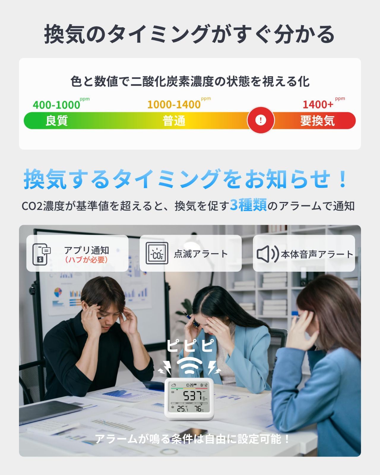 【アラート通知機能&遠隔確認】3種類のアラート「本体の警告音、ディスプレイの数値が点滅、アプリ通知※」で、CO2濃度の変化を通知。外出先からでもお部屋のCO2濃度を確認し、換気アラームで換気のタイミングがすぐ分かります。※SwitchBotハブ製品が必要