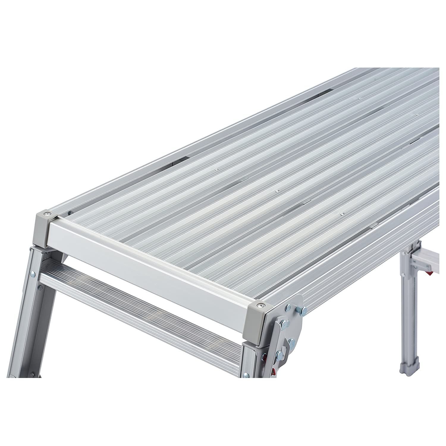 足場スペースよりワイドで安心な脚部伸縮式足場台。段差で威力を発揮するロングストロークの伸縮脚。ワンタッチで操作でき、簡単です。足元にゆとりのある幅広設計。