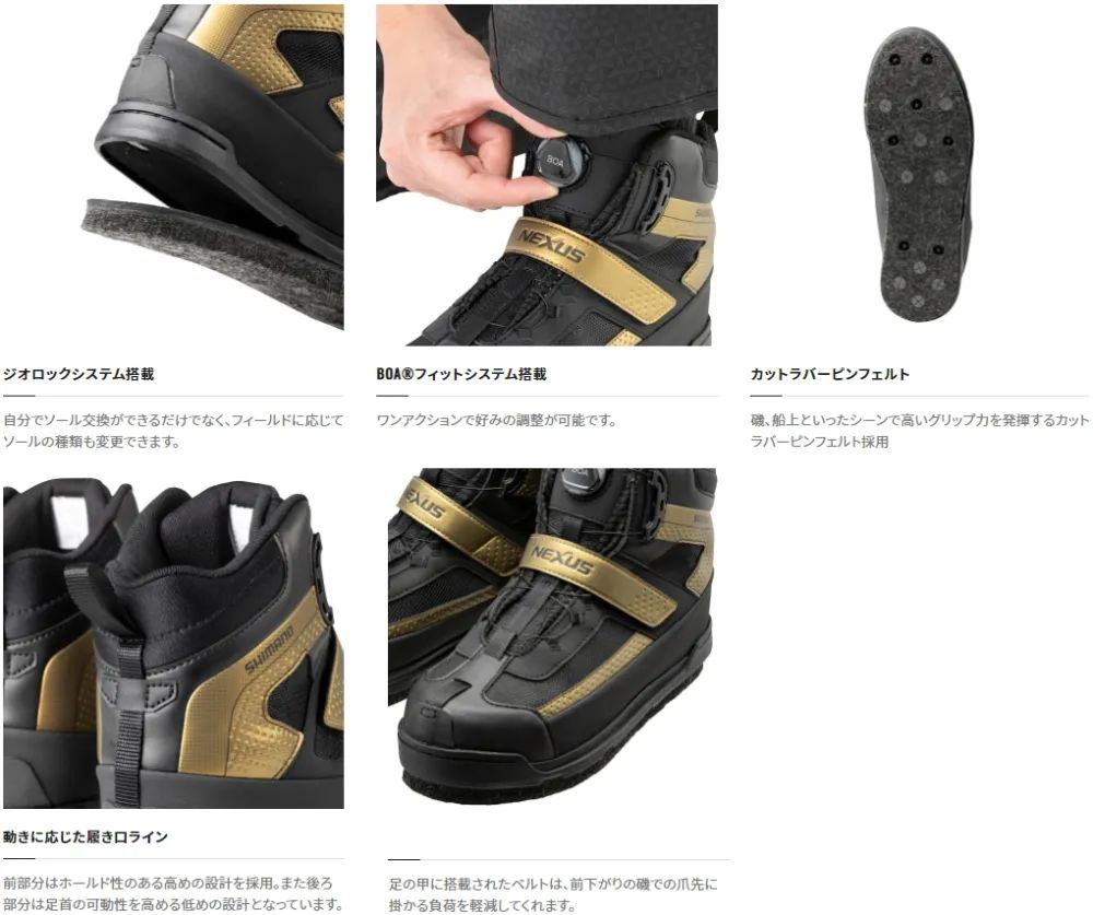 足の甲にホールドテープを採用し、足先に負担が掛かりにくい様になっています。ジオロックも搭載し自分でソール交換も可能。標準装備のソールは磯で定番のカットエアバーピンフェルトを採用しています。BOA(R)フィットシステムも搭載し脱ぎ履きが楽にできます。