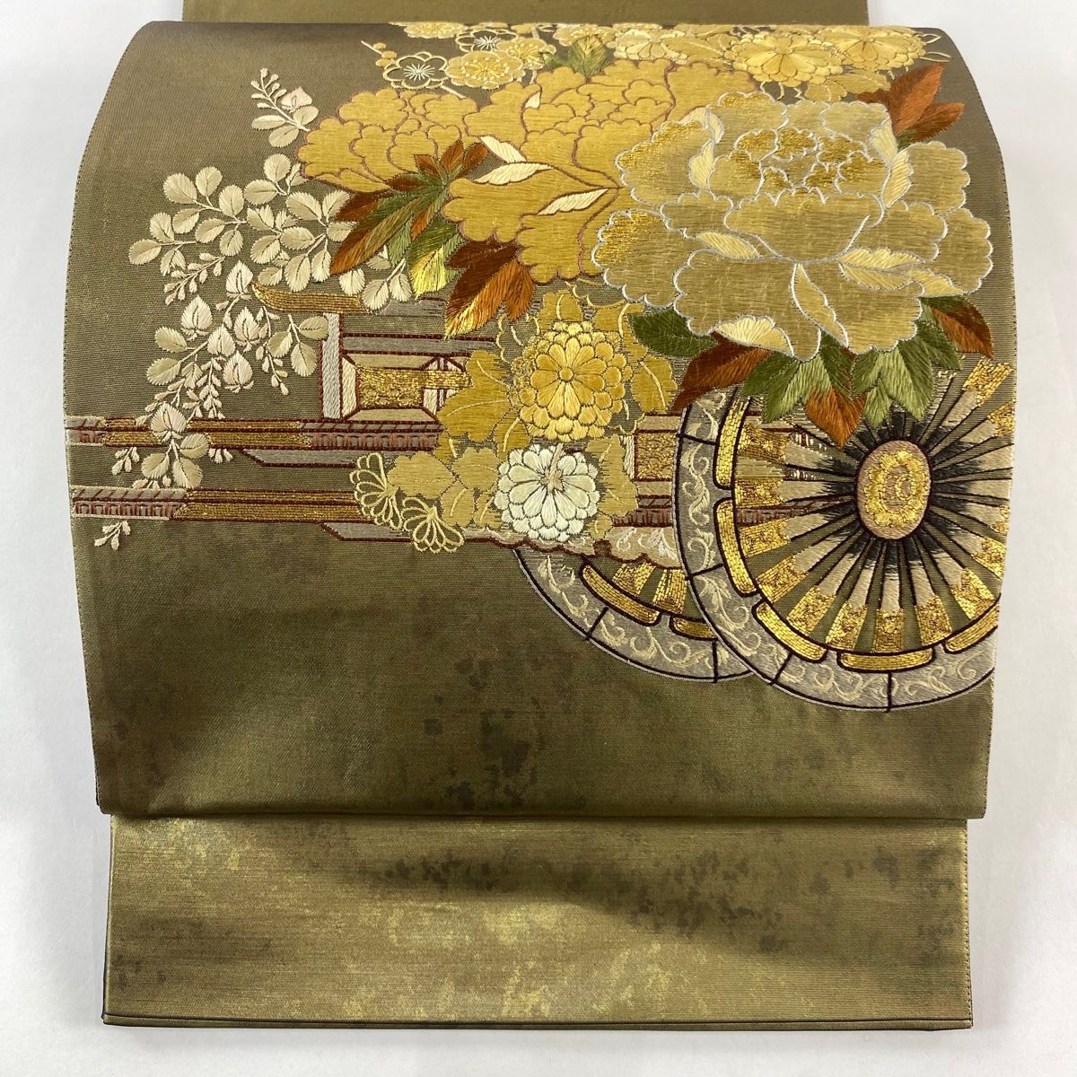 袋帯 秀品 関西仕立て 花車 牡丹 箔 刺繍 金茶 お太鼓柄 正絹