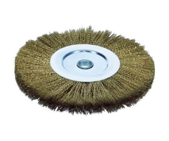 ブラシ形状が円盤型で、外面に向かって放射状に毛が植わっています。円盤状のブラシの中心に穴が開いていて工具、機械などに同径の軸がついていれば取り付けが可能です。金属面の研磨、サビ落とし、バリ取り、塗装はく離。