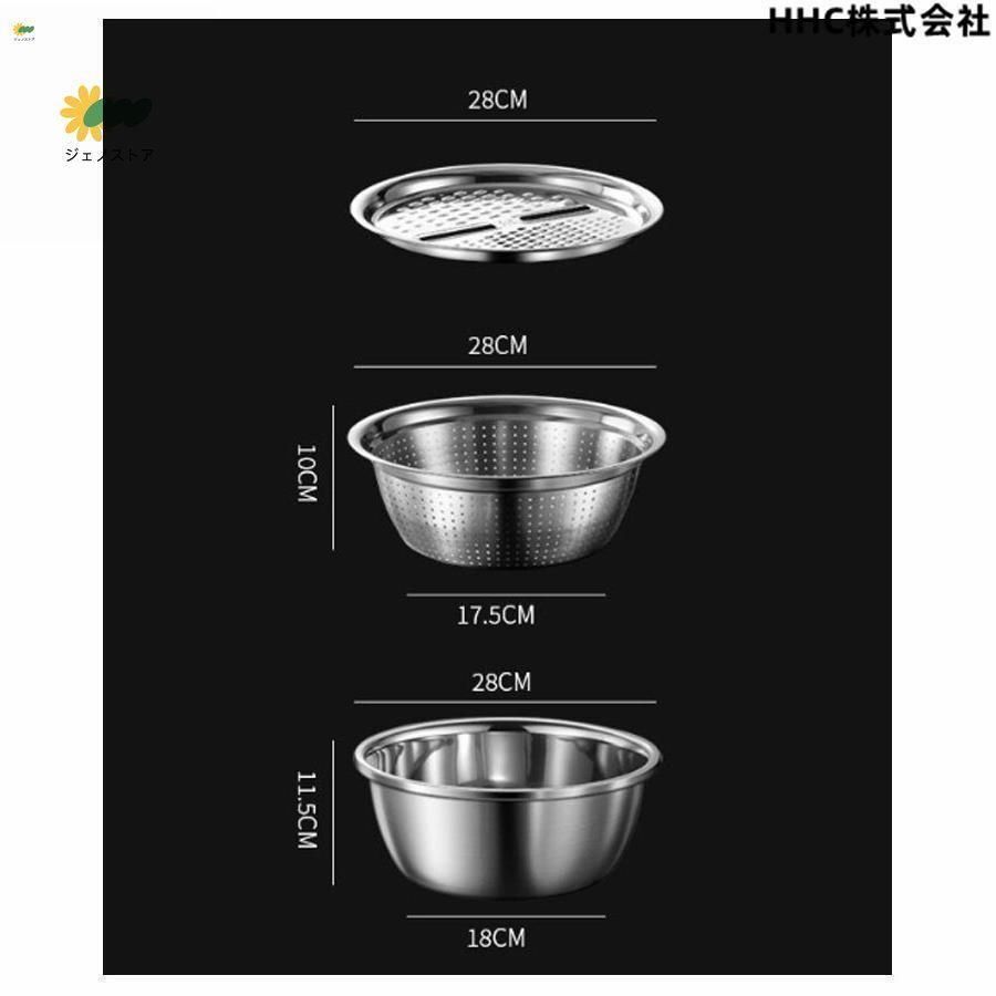 【セット内容】ステンレスボウル、4-in-1スライサー&おろし金、水切りボウル【サイズ】.ステンレスボウル:底幅18×直径28×高さ11.5cm.4-in-1スライサー&おろし金:直径約28cm.水切りバスケット:底幅17.5×直径28×高さ10cm