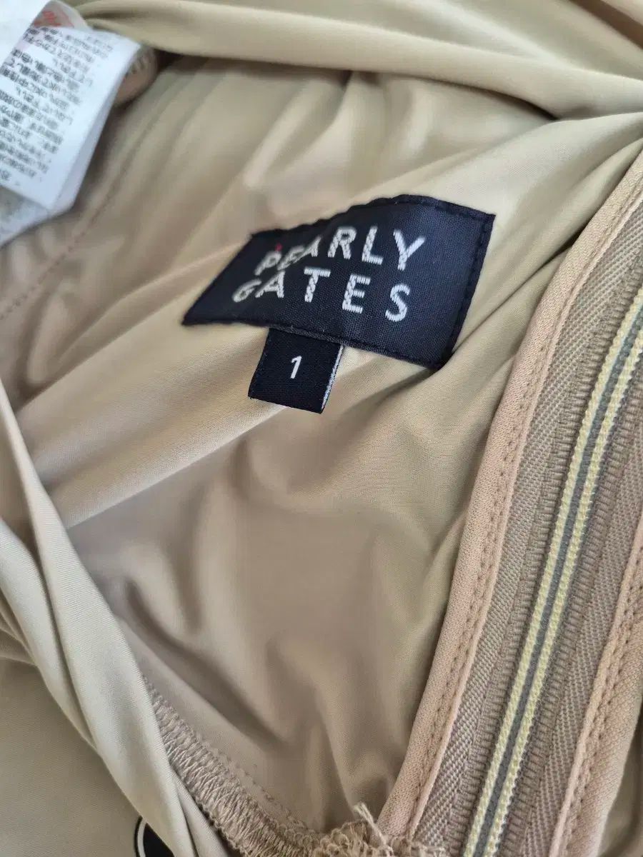 これはパリゲイツの女性用ゴルフジャンパーです。ベージュ色の背景に複数のロゴが印刷されています。両腕に黒いラインを入れてアクセントをつけています。ご不明な点がなければ、すぐに安心してお支払いいただけます!
