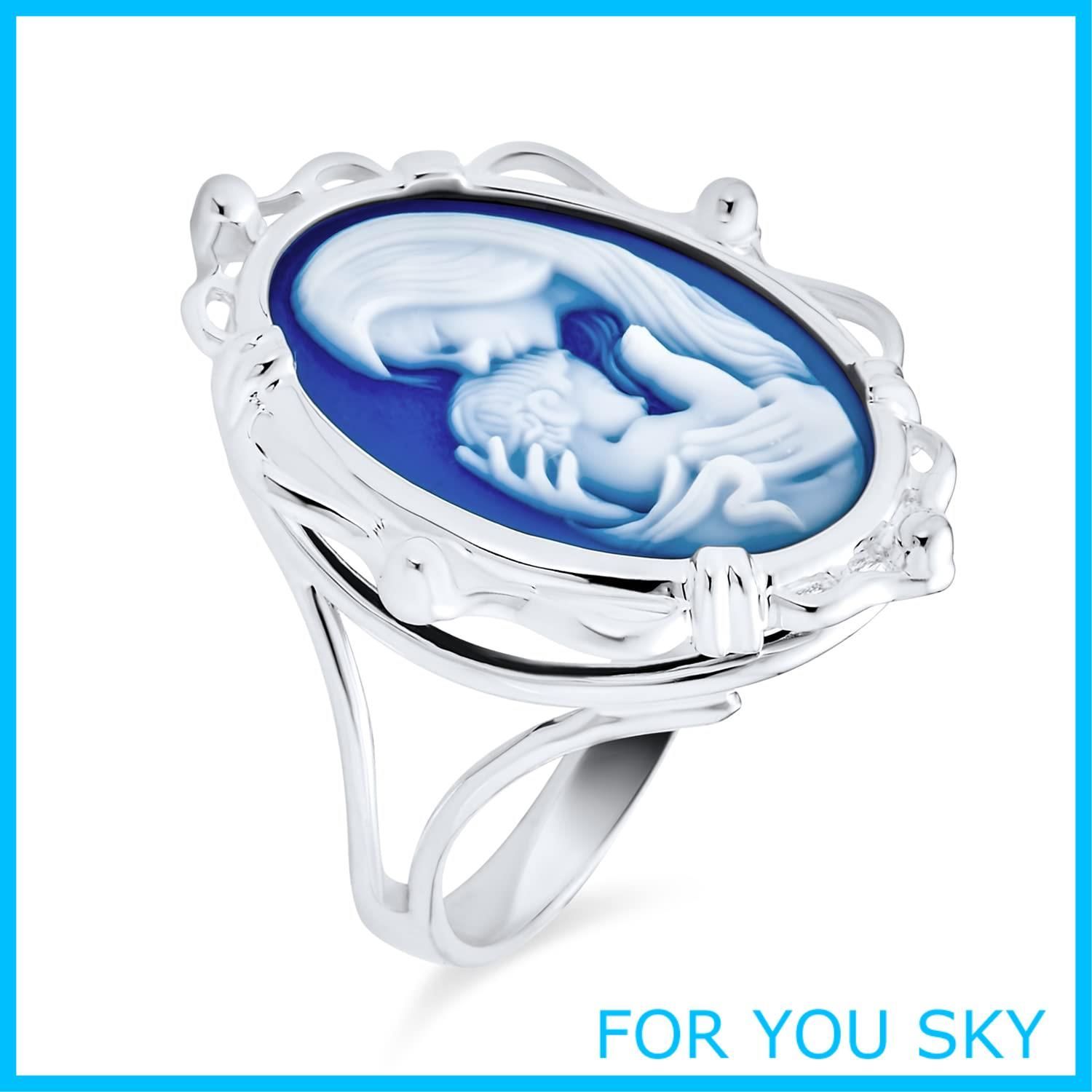 ジャスパーウェア・スタイルとして知られる、大きな枠のスターリングシルバー製カメオ。この大きなカメオ・リングは、ビクトリア朝の定番に新しい命を吹き込みました。このマドンナ・聖母マリア・イエスの威厳のある女性は、シックなブルーカラーを背景にしており、心にしみるほどエレガントです。このカメオ・リングは、ヴィンテージ・ルックがお好きなロマンチックな方にぴったりです。優しくて、温かくて、思いやりがあって、心優しいお母さん。愛を分かち合った記念に、マザー・チャイルド・リングで特別な絆を祝福しましょう。