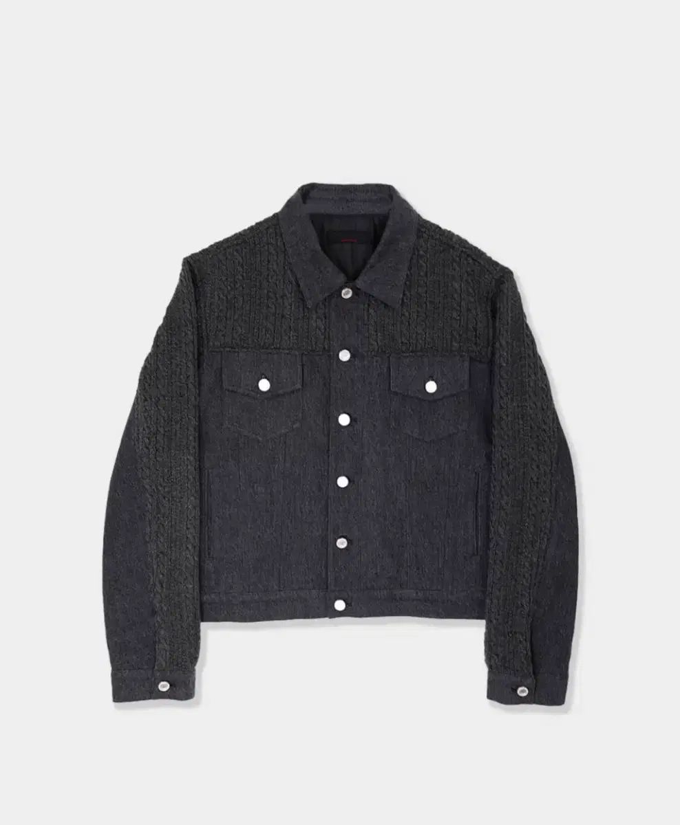 ANYTIMELOREAK ニット デニム ジャケット チャコール カラー M サイズ。ショルダーから下がるニット パッチ が魅力的な 商品です。開封して 実際に着用 は 1回 程度 しました。