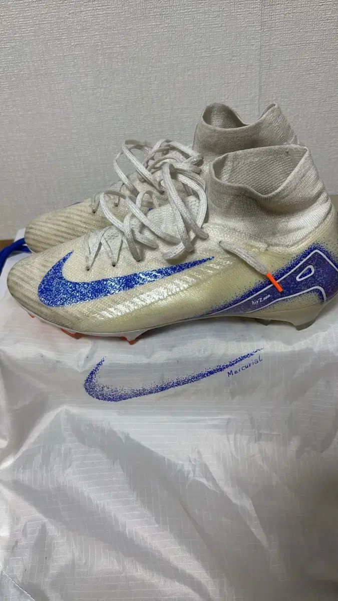 NIKE (ナイキ) スーパーフライ 10 ブループリントパックサッカーシューズ白い背景にブルーのNIKE (ナイキ) キロゴがアクセントになっています。ゴングはオレンジ色です。別途質問はありませんので、すぐに安全な支払いを行ってください!