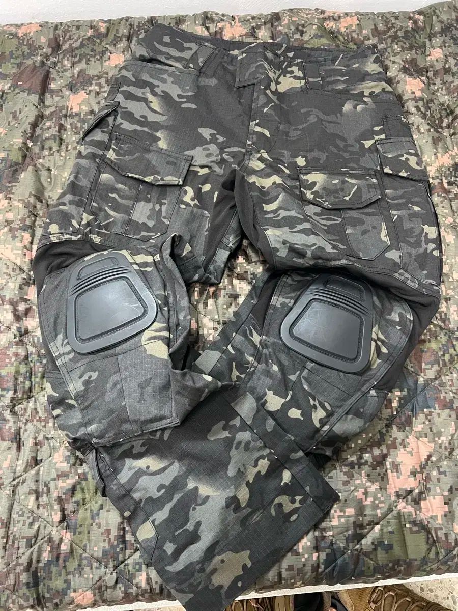 こちらは黒のマルチカム柄のミディアムサイズのエイドーギア上下セットです。腕にはマジックテープが付いているので、様々なパッチをつけることができます。全体的に使用感の少ない良い状態です。売り手のスペックは約175/76で、よく合います