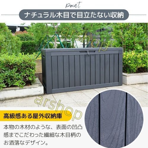 【ご用途に合わせて選べる4サイズ】118L--コンパクトで場所を選ばない基本サイズ--ベランダのちょい収納、ガーデニング道具、子供のおもちゃ収納、玄関先の靴箱代わりに。狭いスペースでも活用可!170L--スタンダードな使いやすさ--一般的な家庭の庭用品(芝刈機燃料、ホース、クッション)、自転車・バイク用品、キャンプギア収納に最適。270L--スタンダードな使いやすさ--重い工具・資材(土・肥料袋)、大型ガーデニング用品、非常用防災備蓄品の収納に。頻繁に動かす必要がある場所で活躍!300L--スタンダードな使いやすさ--大量の物品収納、重い機材、長期間の保管に最適。頻繁な開閉でも楽々!蓋の補強でより高い耐荷重性を実現。