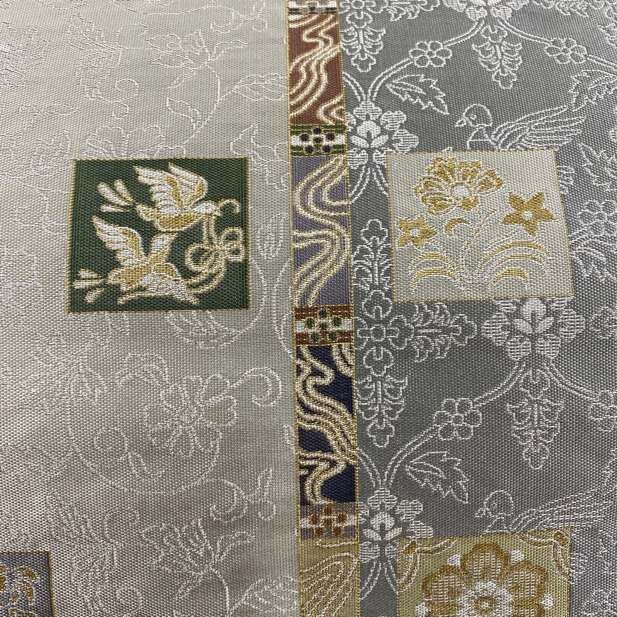 袋帯 秀品 落款 誠之輔 花喰い鳥 草花 箔 灰白 六通 正絹