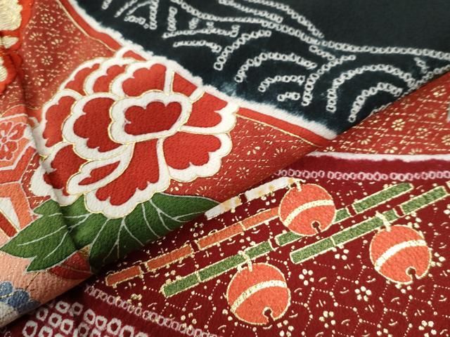 平和屋着物 訪問着 絞り 刺繍 几帳牡丹鈴吉祥花文 黒地 金彩 ロング丈 正絹 yc