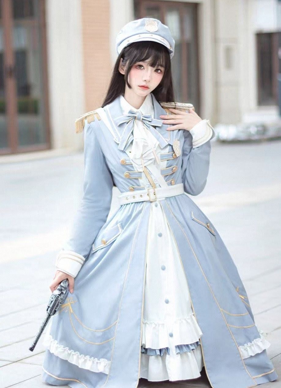 ミリタリー セットアップ ケープ ワンピース クラシカル フ ドレス フリル リボン 金ボタン Aライン ハイウエスト コスプレ 地雷系 量産型 原宿系 病みかわいい 甘辛 レディース 秋冬 青白 清楚系 マント付き ゴシック ロリータ 長袖