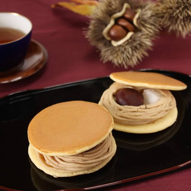 ■ふんわりとした風味豊かな生地にモンブランあんと渋皮付き一粒栗・求肥餅を挟みこみました。和と洋の美味しさが重なる創作菓子です。