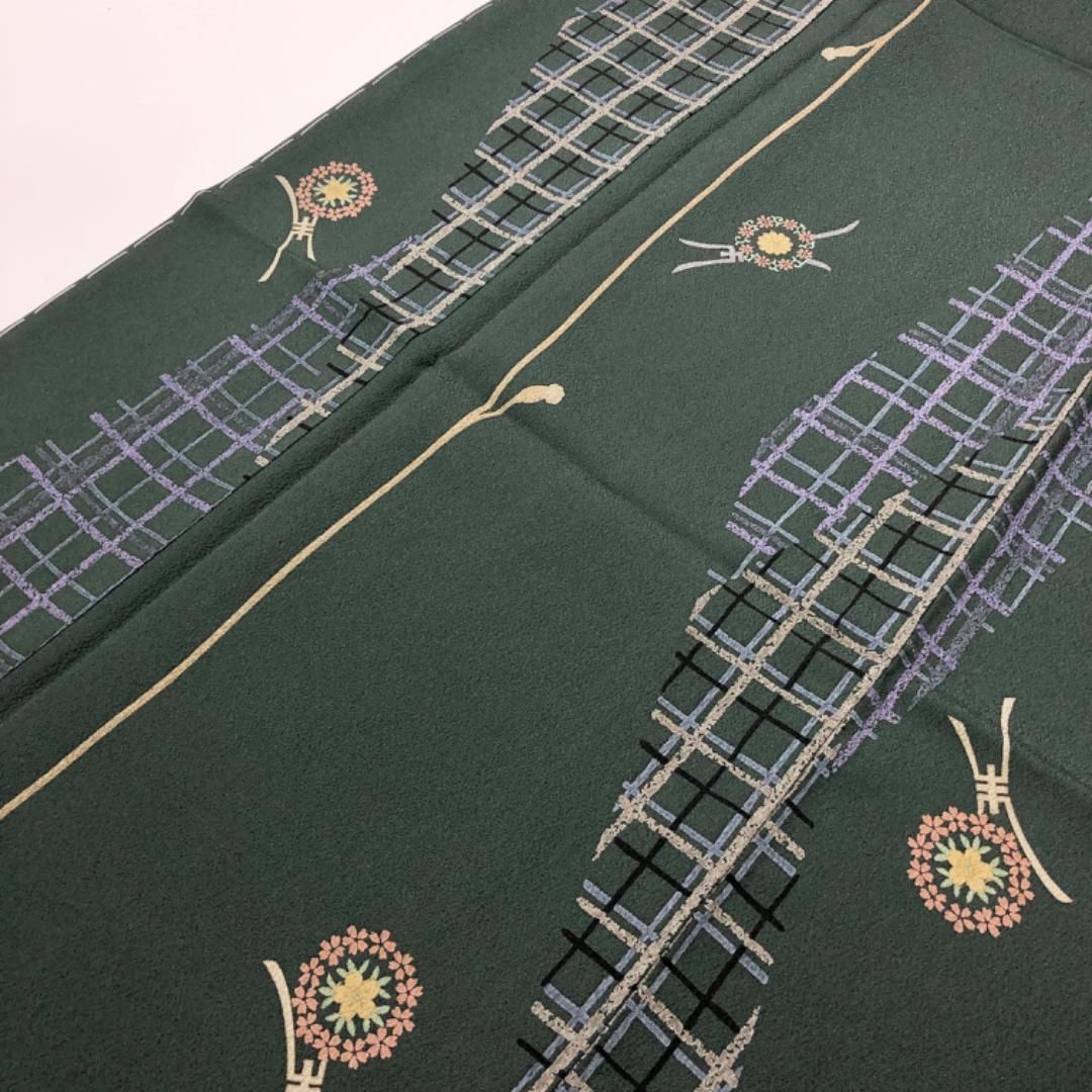 小紋 縦柄 丸に花模様 組紐 黒緑色 しつけ糸 ガード加工 K-5286