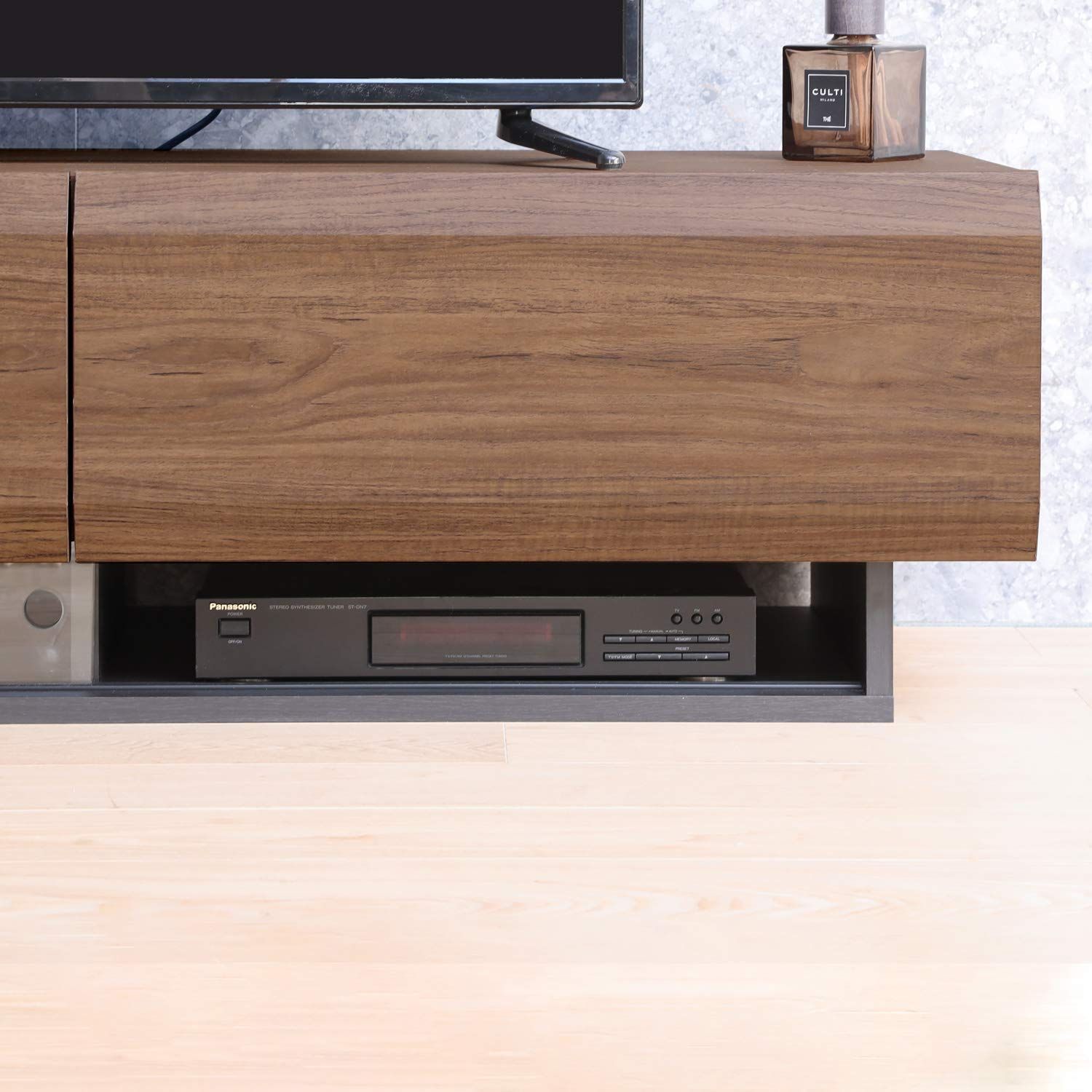 黒の台輪によってテレビ台が浮いているように見えるデザイン。