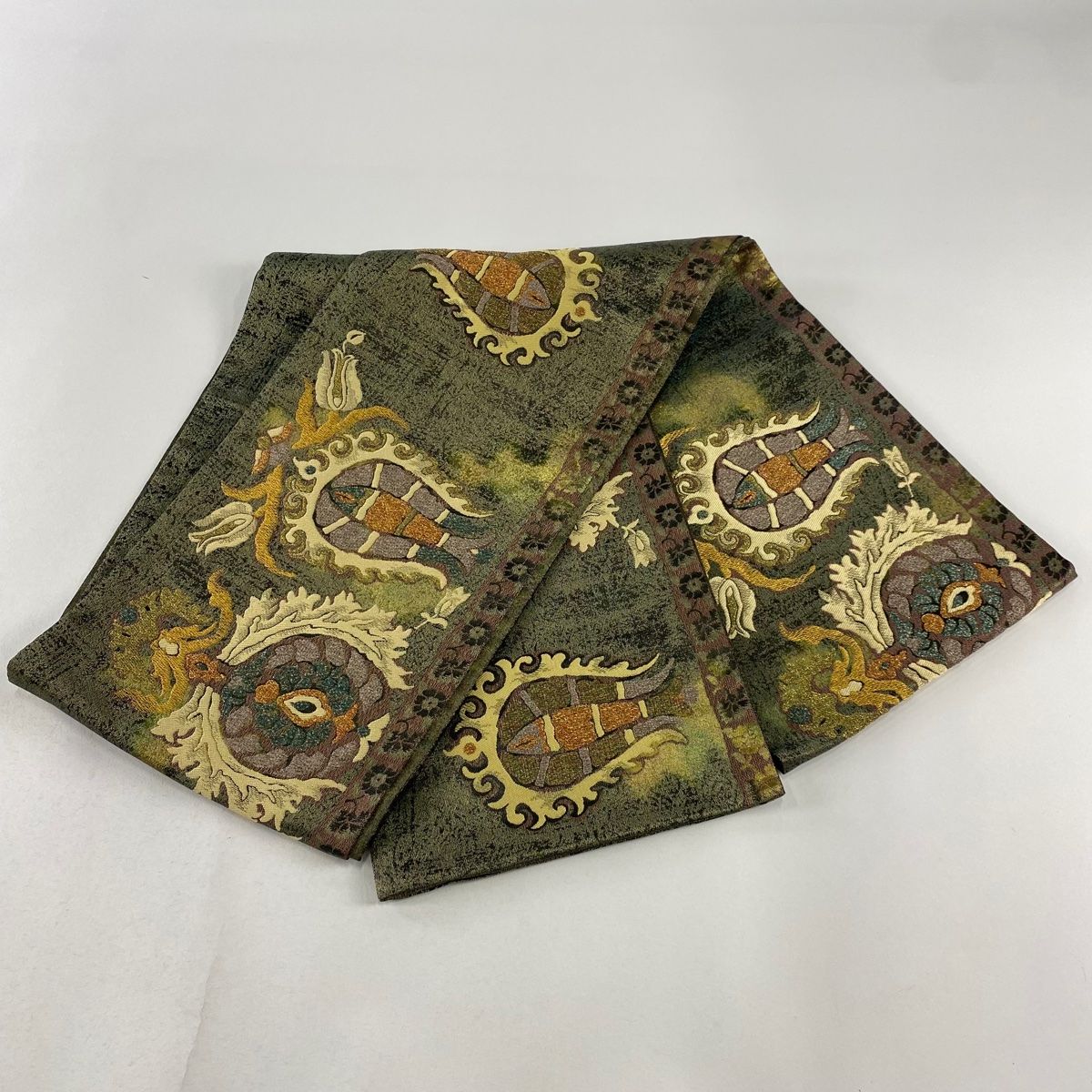 袋帯 草花 幾何学模様 金糸 箔 灰緑 お太鼓柄 正絹