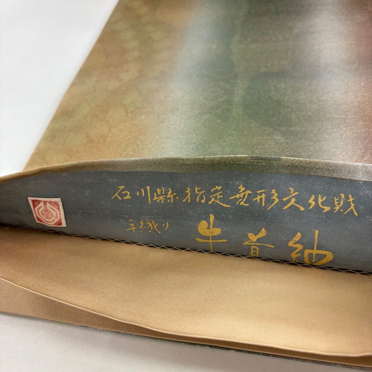 袋帯 落款 牛首紬 幾何学 ぼかし よもぎ色 全通 正絹