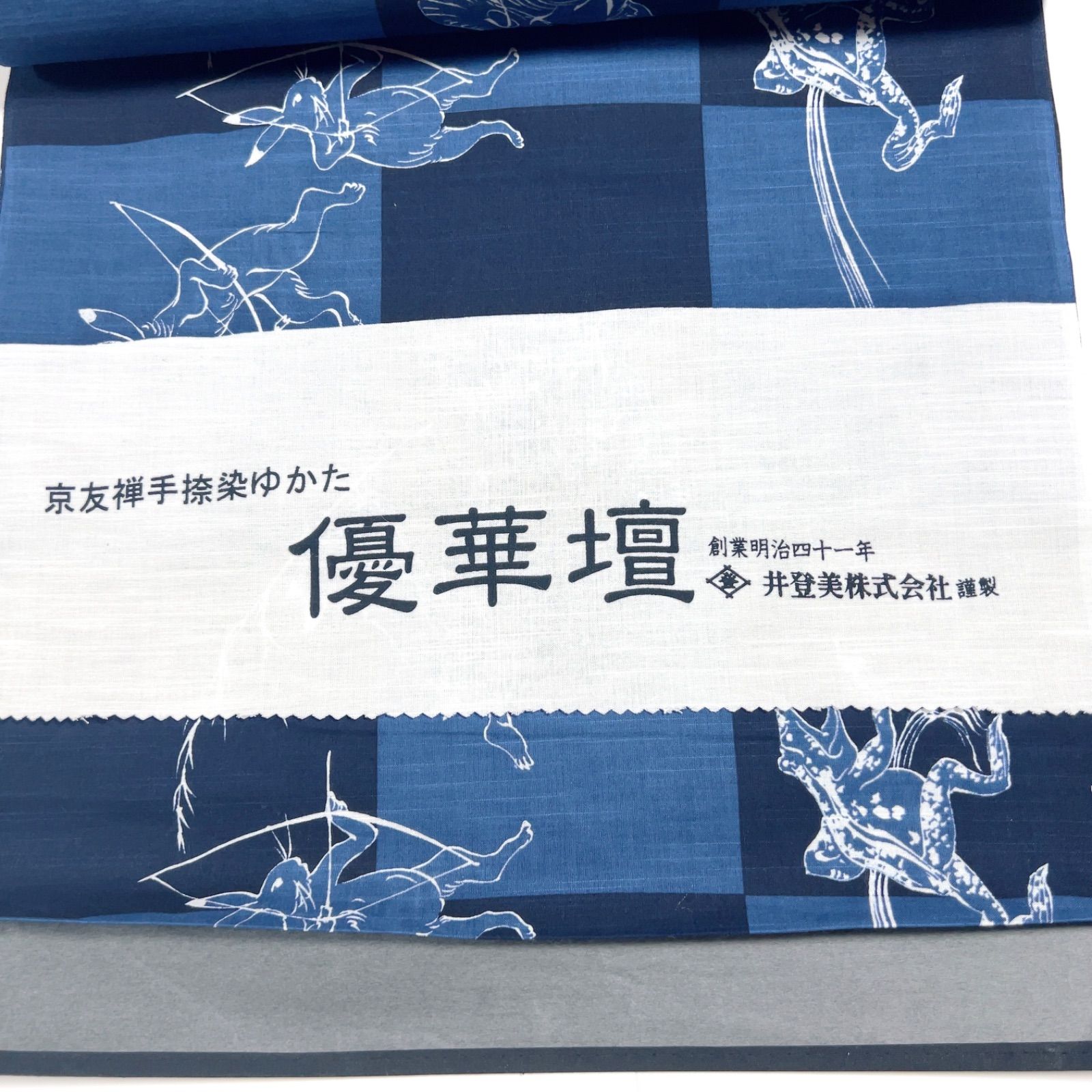 紺の市松に鳥獣戯画が染められた、とてもかっこいい男性用の浴衣生地です。