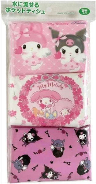 サンリオの人気キャラクターマイメロディとクロミがコラボしたデザインの水に流せるポケットティシュです。