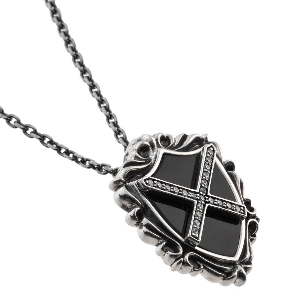 A study in monochrome poise. This shield-shaped pendant sets deep black synthetic onyx beneath a crisp X rendered in sparkling cubic zirconia. Polished sterling frames the motif, while the scrolling border is finely carved to catch light and shadow—impeccable up close, elegant at any distance. The palette is clean and versatile, pairing effortlessly with everything from a tee to tailored jackets. Comfortable for daily wear yet refined enough for evening, it brings a quiet, emblematic presence to the chest.
