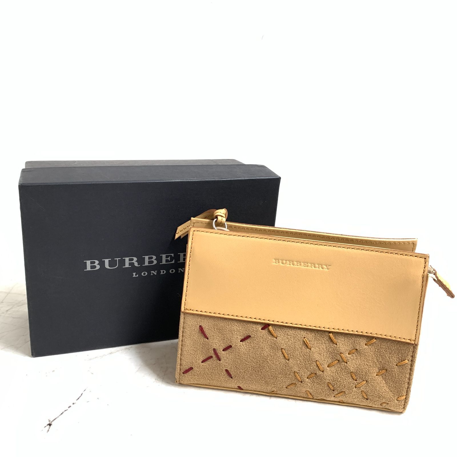 f 001 B バーバリー ポーチ スエード ステッチ レザー 化粧ケース ロゴ型押し ベージュ