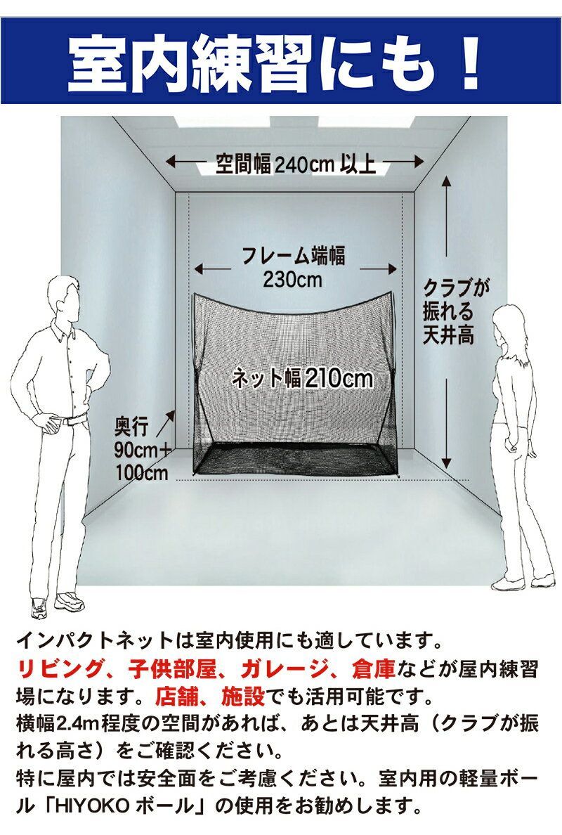 (5)室内で使用の場合、ネット横幅2.1m、フレーム横幅2.3mに対して、2.4m幅の空間があればOKです。あとはスイングを前提に天井高をチェックしてください。