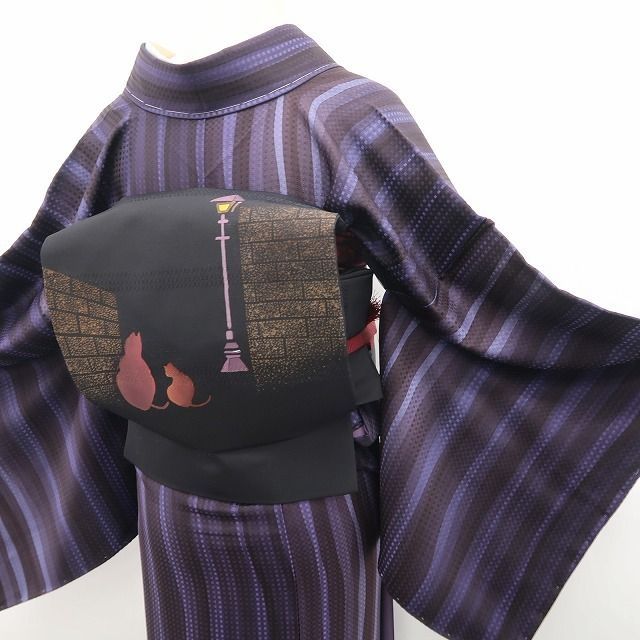 ❁tomihisa❁ 猫 着物 正絹 街灯に照らされる静寂の猫 なごや帯 7044