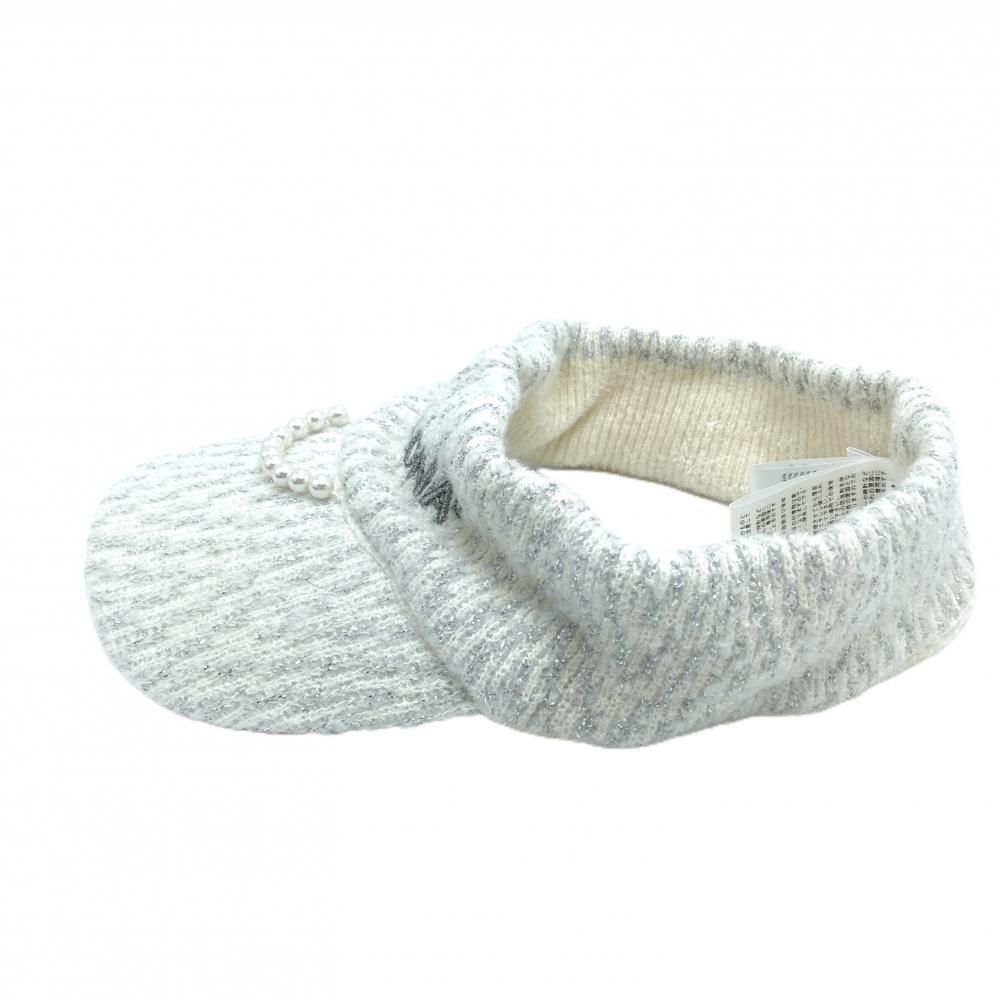 超 マークアンドロナ ニットサンバイザー 白×グレー 総柄 ウール混 パールチャーム付 レディース ゴルフウェア MARK&LONA