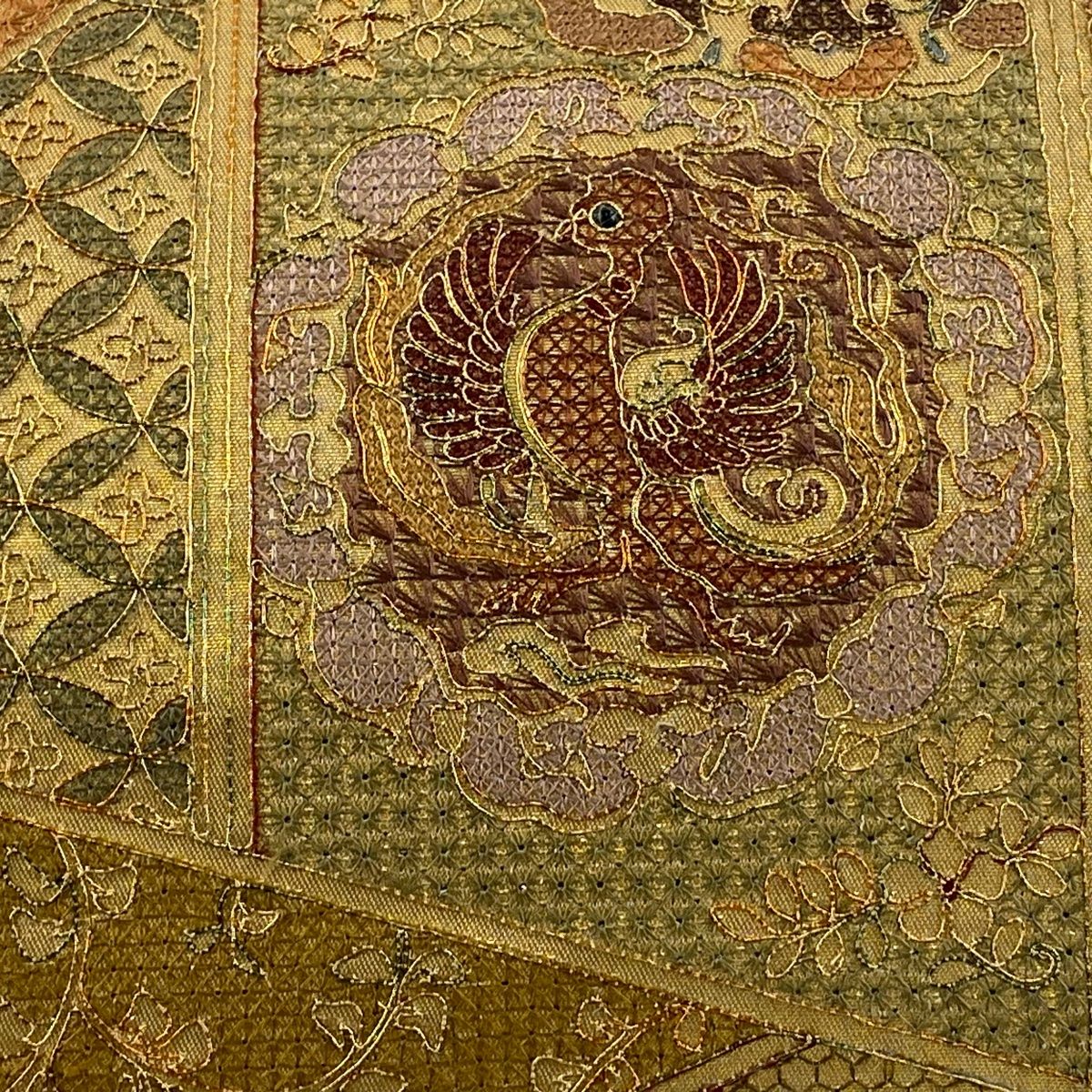 袋帯 秀品 花鳥 七宝 金糸 箔 金色 お太鼓柄 正絹