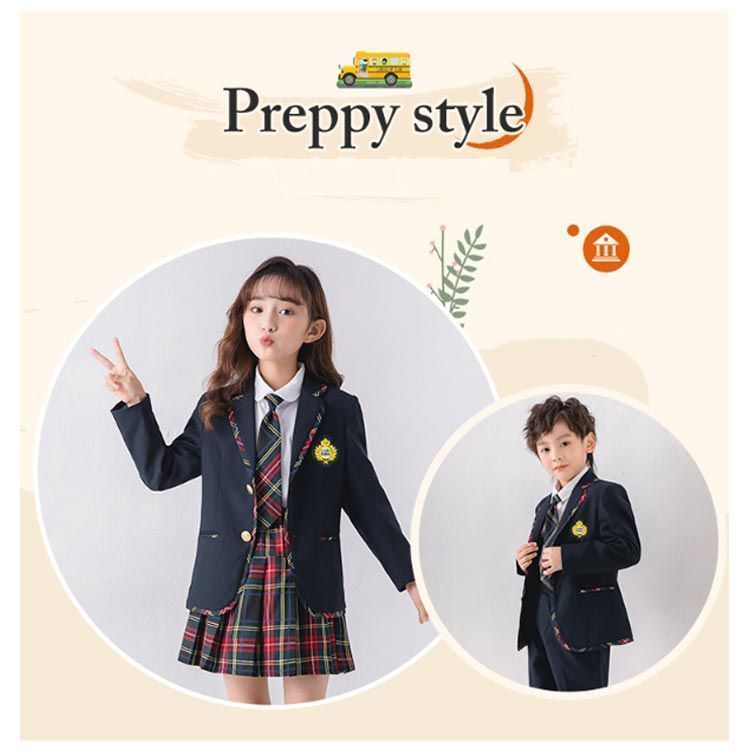 女の子:ジャケット+スカート+シャツ+ネクタイ+胸章+靴下。