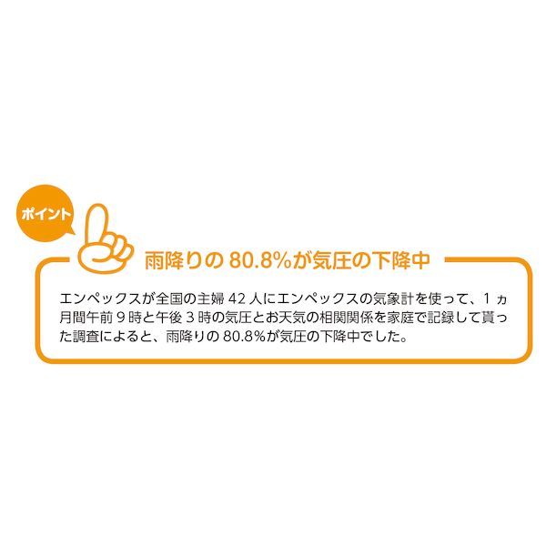●気圧センサを内蔵し気圧の変化から約半日後のお天気傾向を「晴」「快方に向かう」「下り坂」「雨」の4つのシグナルでお知らせ。