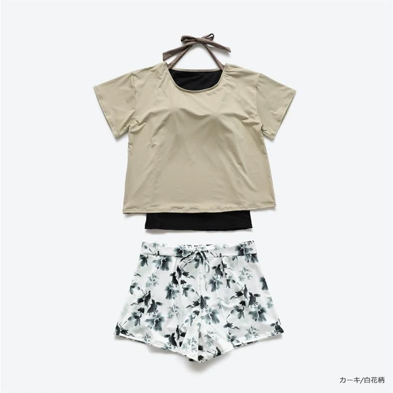 水着 レディース カバーアップ水着 体型カバー タンキニ 2点セット ラッシュガード 半袖 大きいサイズ セット水着 ママ水着 短パンつき 花