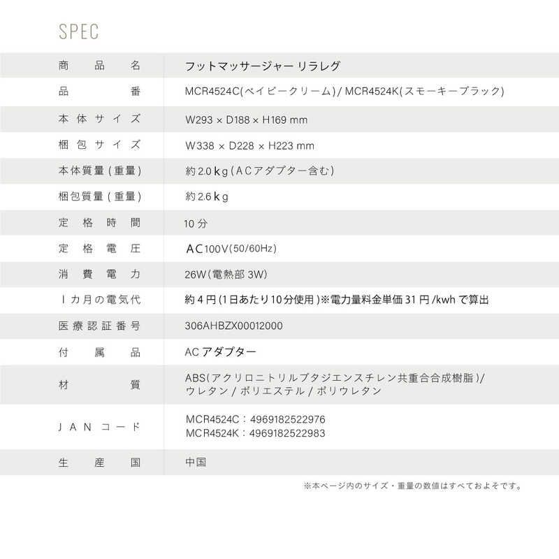 ●乗せるだけで足をもみほぐし本体底面とサイドのそれぞれ異なる2種類のマッサージ機能で足を心地よくほぐします突起付き回転ローラー:底面のローラーが足裏全面をほぐし、突起でこりを細かく押しほぐし立体クッション :足をサイドから大きく包み込み、立体的な動きで足先から血流を促進