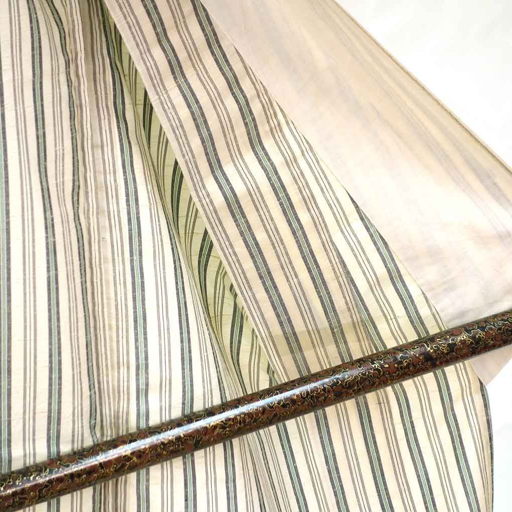正絹の単衣紬着物です。生成色にグリーンの縦縞模様でカジュアル用途にお召しいただけます。身長155cm-165cm程度、ふくよかな方にもお勧めのゆったりサイズです。広衿仕立。裄の縫い代は2cm程度ありそうです。