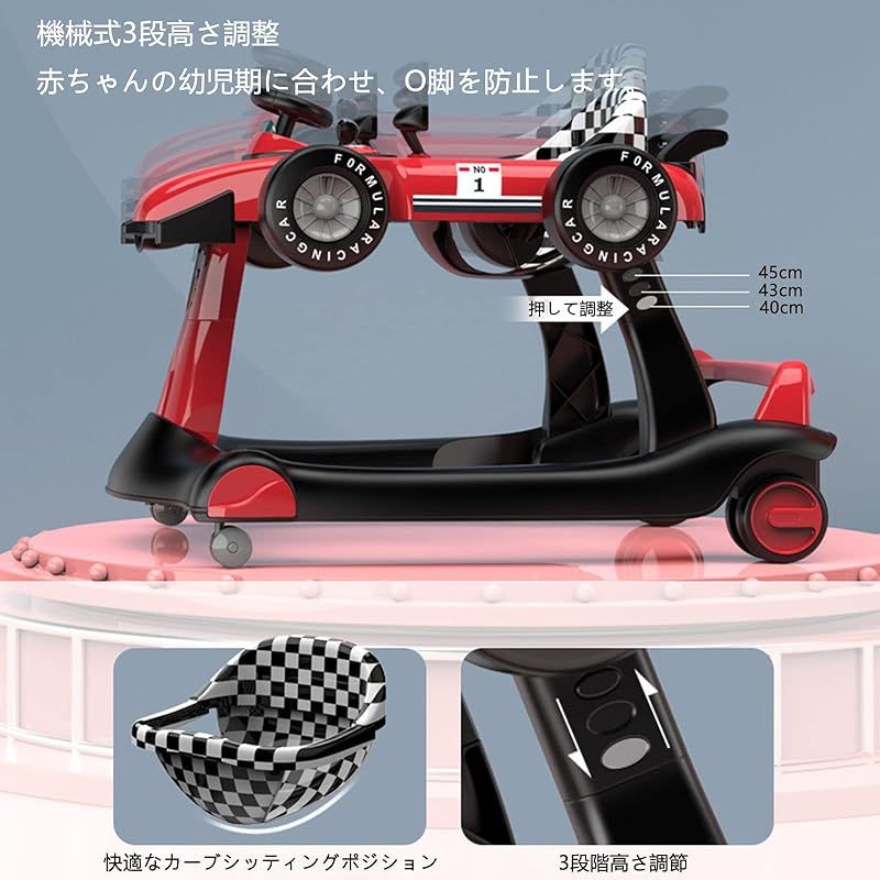 商品名:歩行器 ベビーウォーカー 赤ちゃん 歩行機 育児 3way ウォーカー/手押し車として使用可能 歩く練習 安全ストッパー 取り外し可能 高度調整可能 滑り止め 車形 安全 音楽を再生可能 6か月 室内玩具 (レッド)