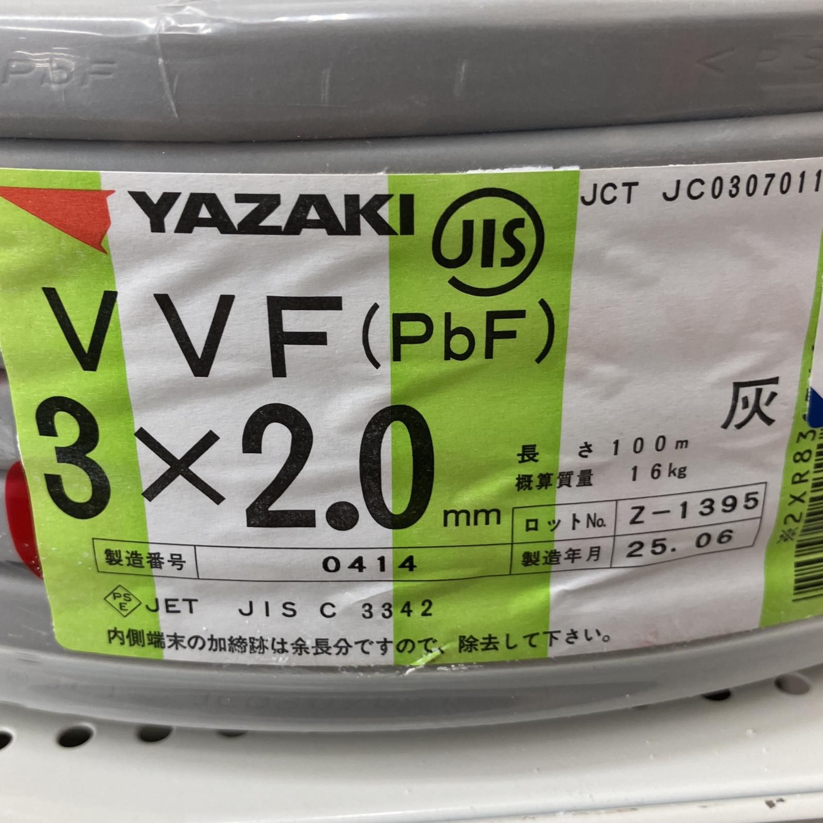 YAZAKI 電材 VVFケーブル グレー 3芯2 0㎜ 100 m 2025 06製造