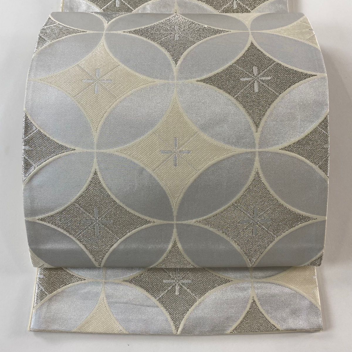 袋帯 証紙 河合美術織物 七宝 金糸 箔 銀色 六通 正絹